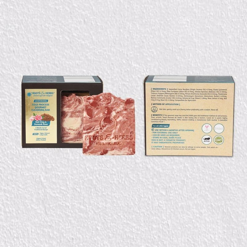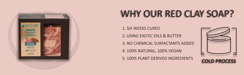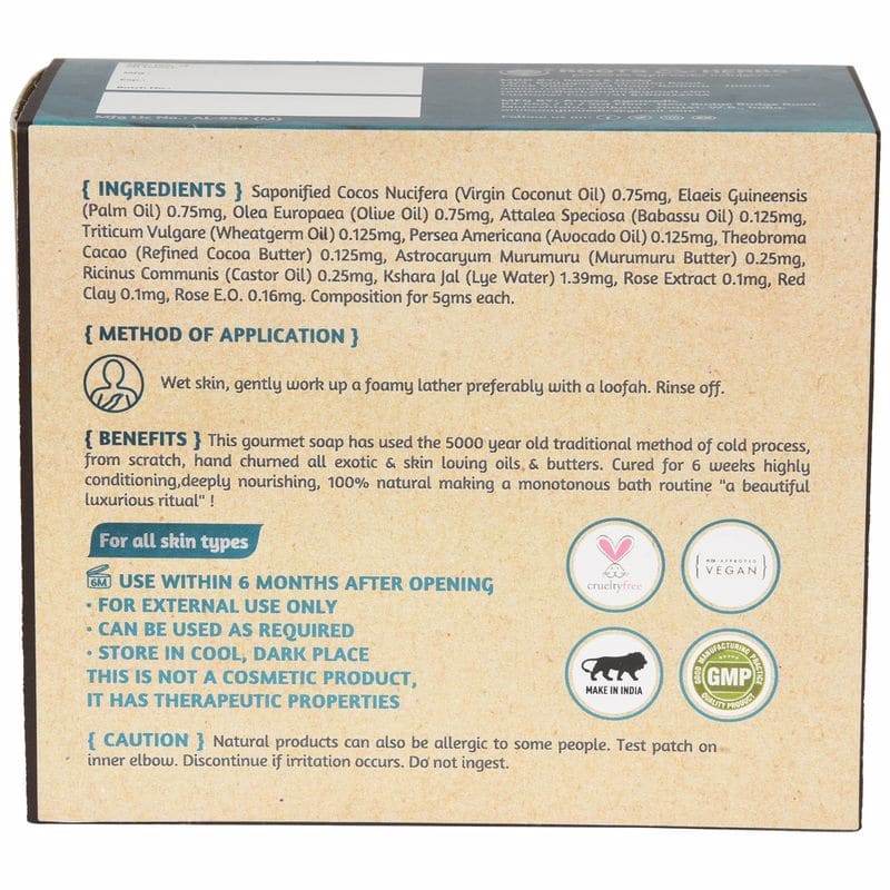 SAPONIFIED COCOS NUCIFERA [VIRGIN COCONUT OIL] 0.75mg ,OLEA EUROPAEA [OLIVE OIL] 1.5mg, ATTALEA SPECIOSA [ BABASSU OIL]0.125mg, TRITICUM VULGARE [WHEATGERM OIL] 0.125mg, PERSEA AMERICANA [ AVOCADO OIL] 0.125mg, THEOBROMA CACAO [REFINED COCOA BUTTER]0.125mg, ASTROCARYUM MURUMURU [ MURUMURU BUTTER]0.25 mg, RICINUS COMMUNIS[CASTOR OIL]0.25 mg, KSHARA JAL [LYE WATER]1.39 mg, ROSE EXTRACT 0.1mg , RED CLAY 0.1mg , ROSE E.O 0.16mg COMPOSITION FOR 5gms EACH