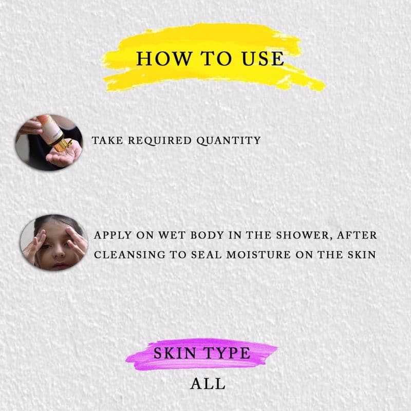 Apply to a wet body in the shower, after cleansing, to seal moisture into the skin and rinse off with water.